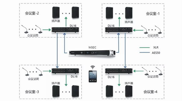 M32C具有雙AES50網(wǎng)絡(luò)接口,最大可擴(kuò)展到96個(gè)輸入和96個(gè)輸出。根據(jù)會議室音頻信號的傳輸通道需求,可將DL16/DL32分別配接在兩個(gè)不同的會議室,僅通過兩根cat5類網(wǎng)線便能實(shí)現(xiàn)兩個(gè)會議室的集中控制。通過ipad等應(yīng)用軟件進(jìn)行混音和信號分配,并且M32C允許多臺應(yīng)用設(shè)備接入控制,可用兩個(gè)ipad分別控制兩個(gè)會議室。M32C前面板配備A類USB插口用于音頻和數(shù)據(jù)傳輸,可實(shí)現(xiàn)會議錄音功能,導(dǎo)出導(dǎo)入wav音頻格式文件。