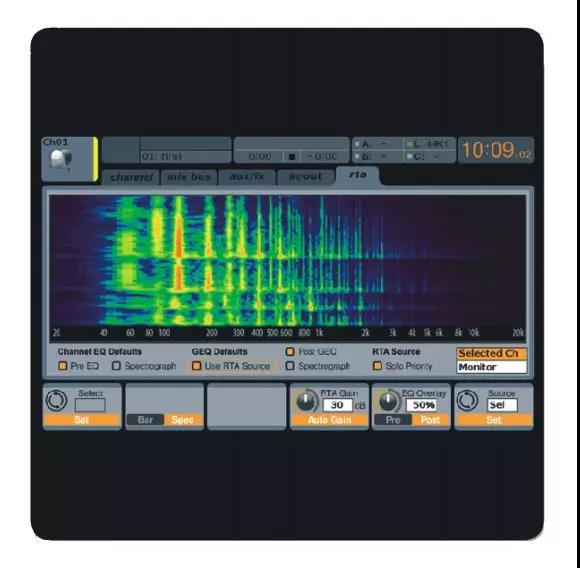 M32C內(nèi)置一個(gè)高精度的100段實(shí)時(shí)頻譜分析儀,而且可以在M32-EDIT軟件.上顯示出來。這個(gè)高精度的實(shí)時(shí)頻譜分析儀可以顯示100段的頻率隨時(shí)間變化的能量分布一每10秒窗口就捕捉一-次聲波。RTA的顯示窗[可以獨(dú)立顯示任意一個(gè)信號,也可以顯示所有通道信號以及母線的EQ曲線,還可以直接觀察濾波器的頻譜。讓你更直觀的觀察和控制頻譜均衡量。
