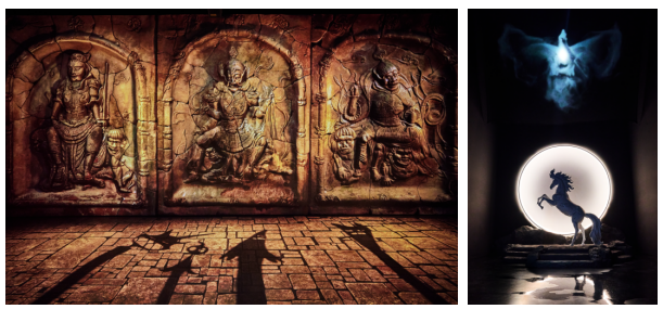 “守護(hù)者”(左圖)和“居西干”(右圖)等展區(qū)也以引人入勝的視覺(jué)效果,帶領(lǐng)參觀者沉浸于新羅的傳奇歷史之中(圖片由Flashbackground Co., Ltd.提供)
